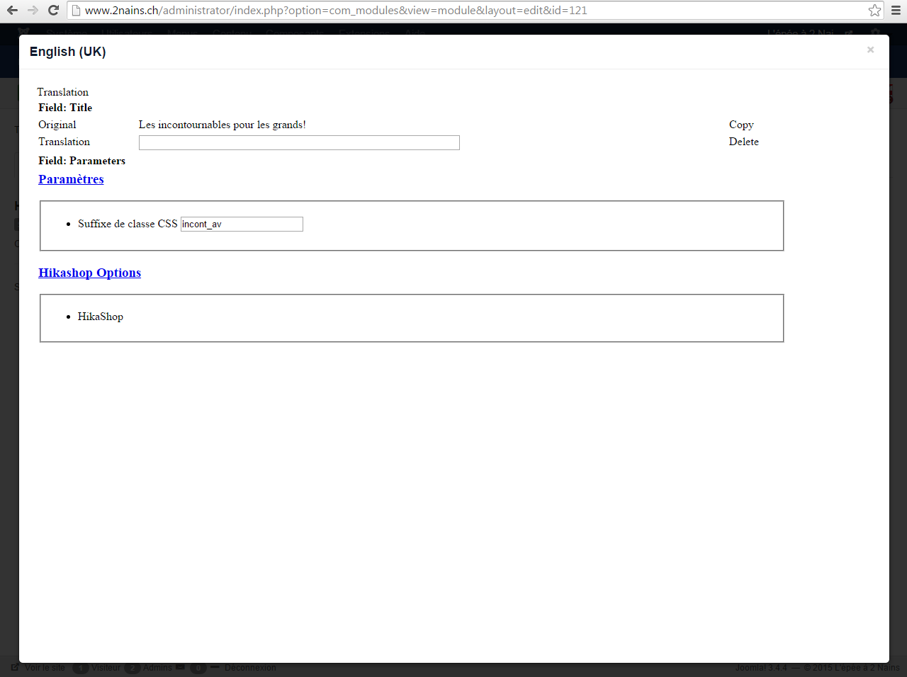 Avec la dernière version de hikashop il y a un bug lorsque l'on essaie de traduire les modules de type "Content display for Hikashop".