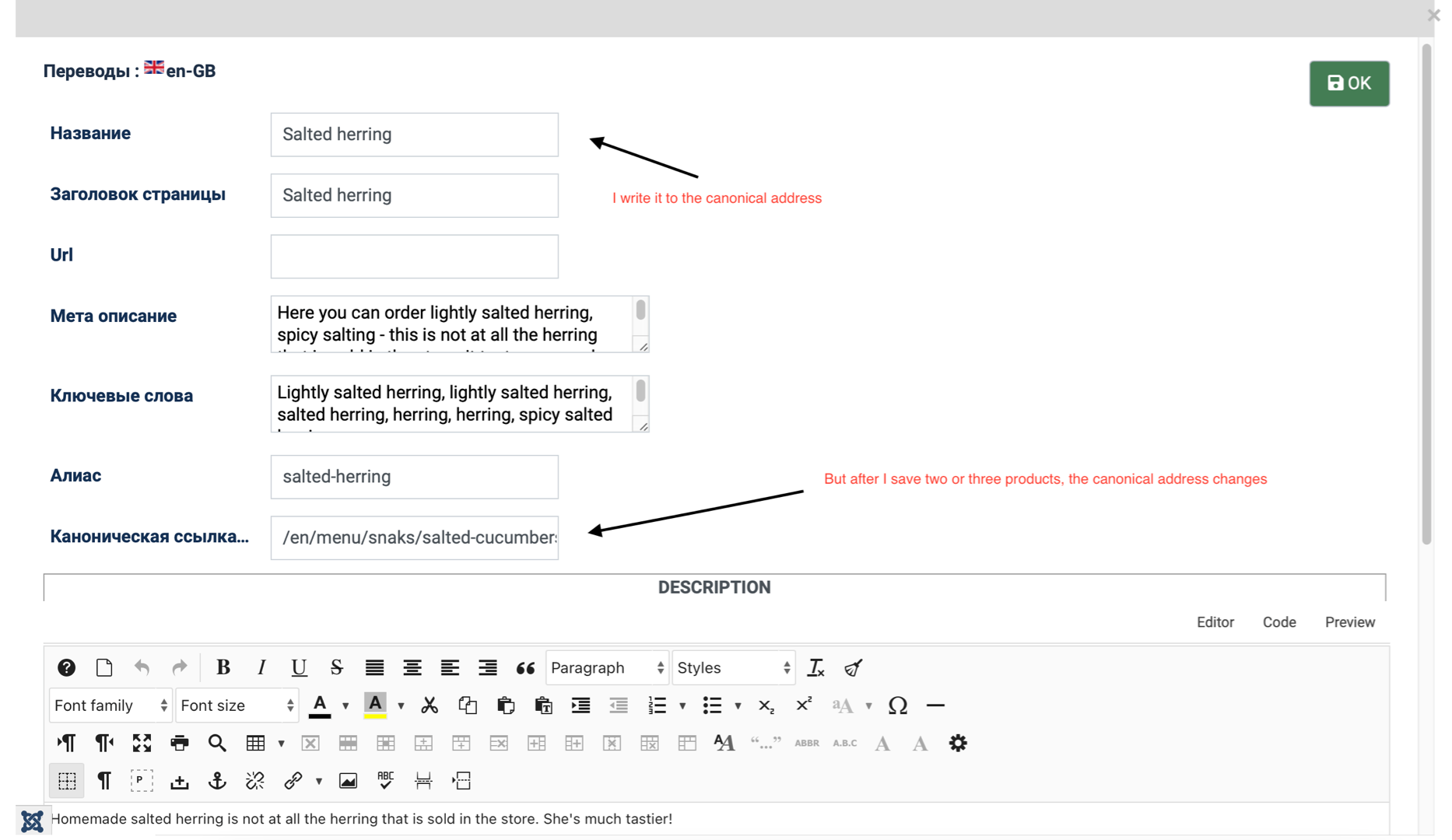 You can see for yourself. Manually write down the canonical address for lightly salted herring and salted cucumbers. And you will see that after saving it will change. Accordingly, when you go to the product, you will see a completely different product. :(