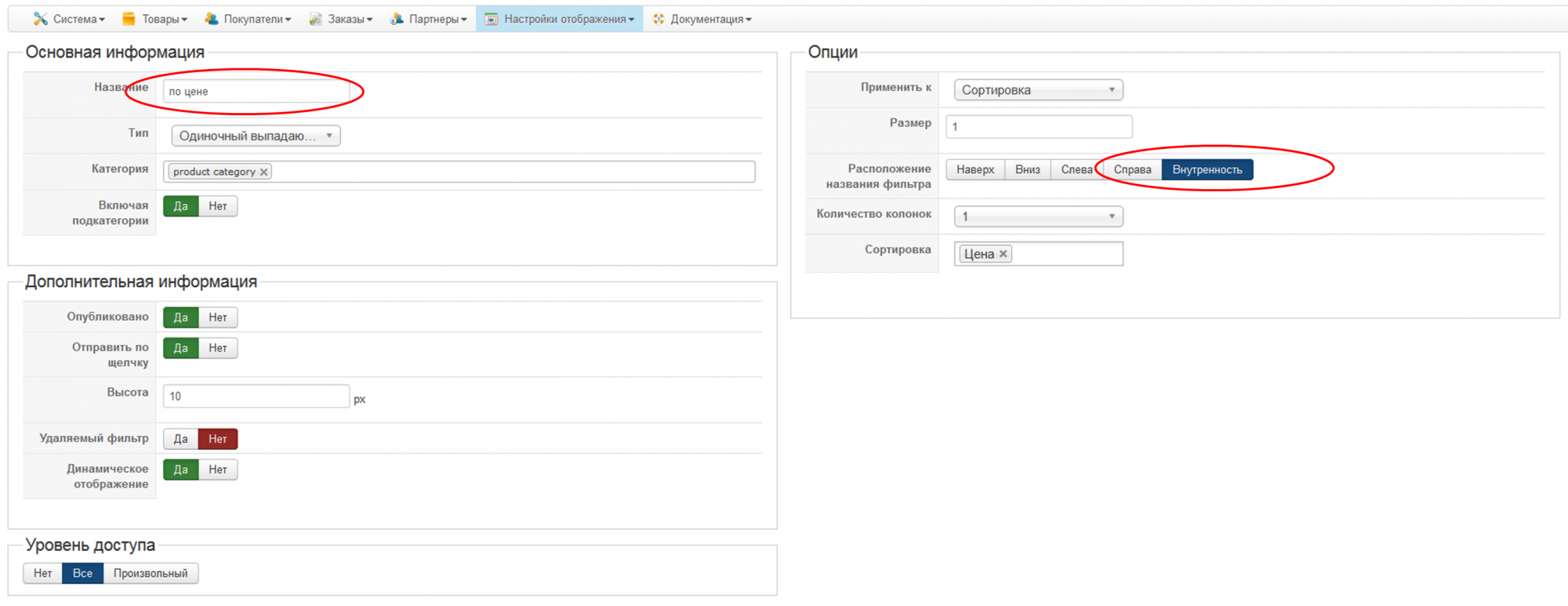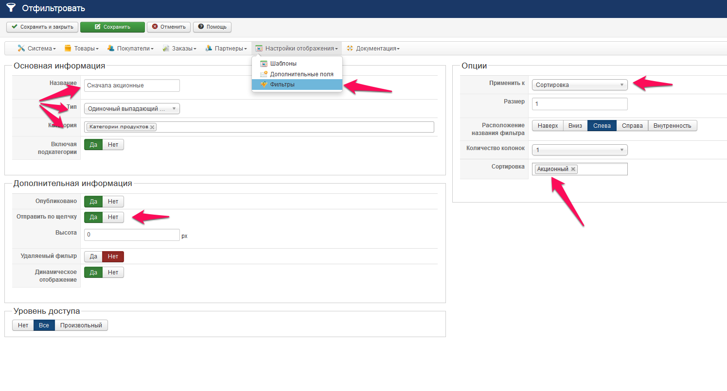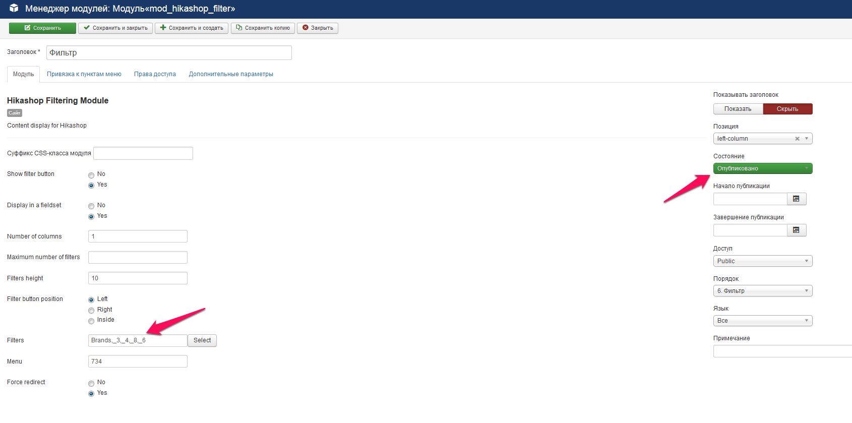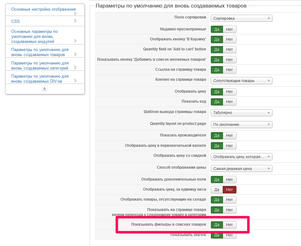 В настройках хики отмечаем отображение фильтра в списке товаров.