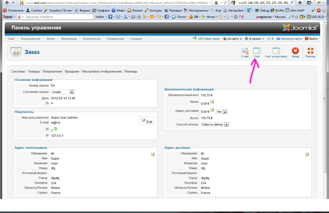 То, что Вы изобразили на рисунке - немного не то. Это для администратора в админпанели, да и то там нет банковских реквизитов поставщика, только реквизиты покупателя. А мне нужно, чтобы такая же кнопка была в магазине со стороны покупателя. И покупатель, оформив заказ, мог нажать на неё и распечатать счёт. Да ещё, чтобы можно было туда впихнуть отсканированную печать и подпись.