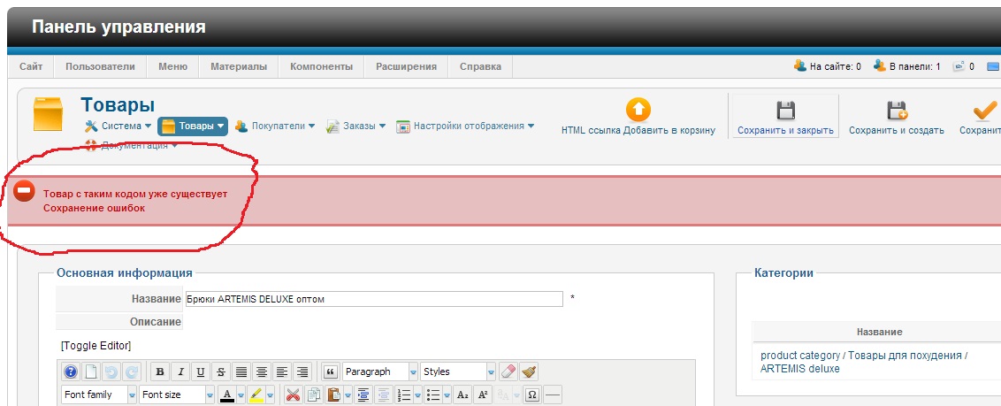 Товар с таким кодом уже существует Сохранение ошиб