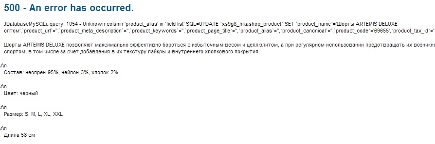 JDatabaseMySQLi::query: 1054 - Unknown column 'product_alias' in 'field list' SQL=UPDATE `xs9g8_hikashop_product` SET `product_name`='Шорты ARTEMIS DELUXE оптом',`product_url`='',`product_meta_description`='', и т.д.