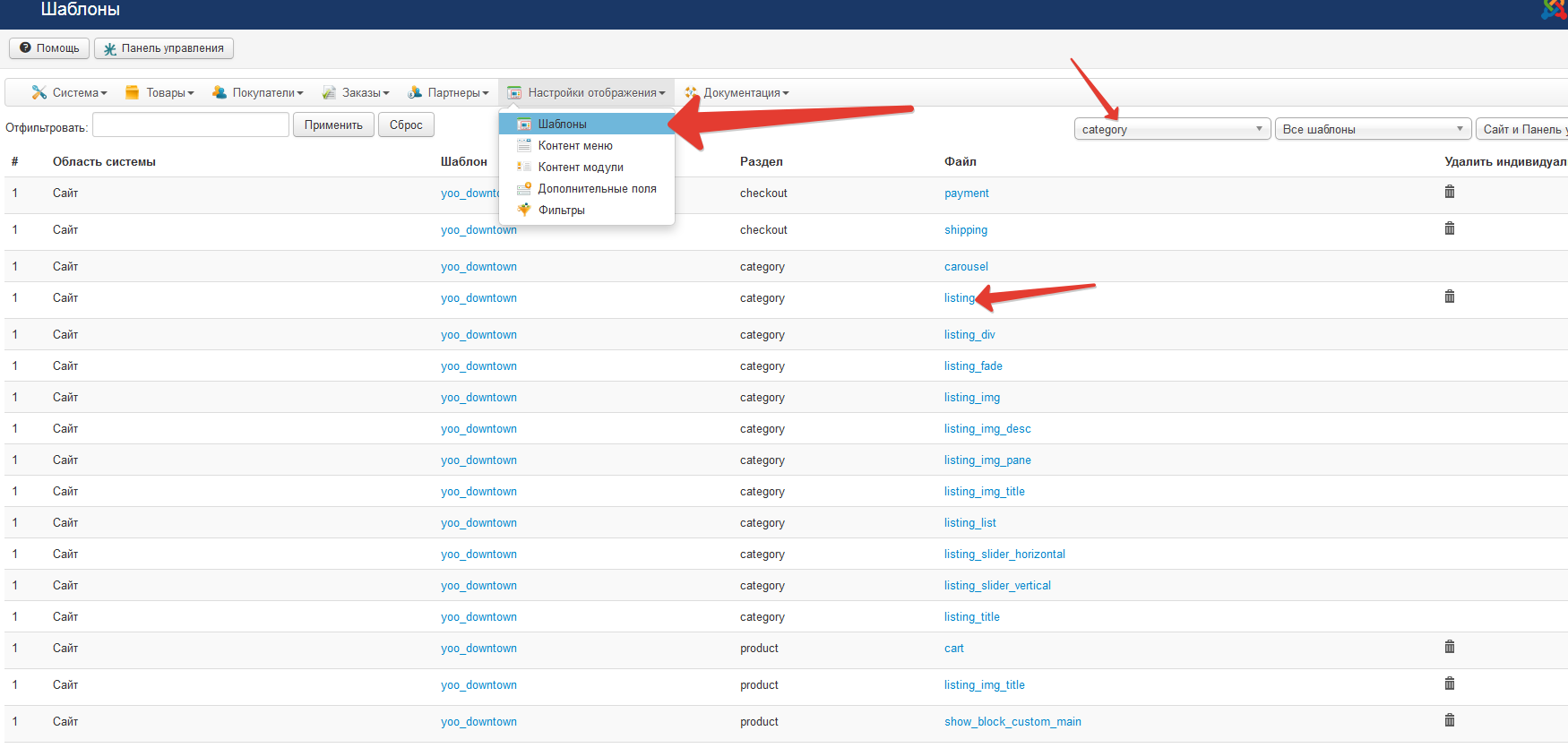 Нужно идти в шаблоны и править файл listing.php из раздела category