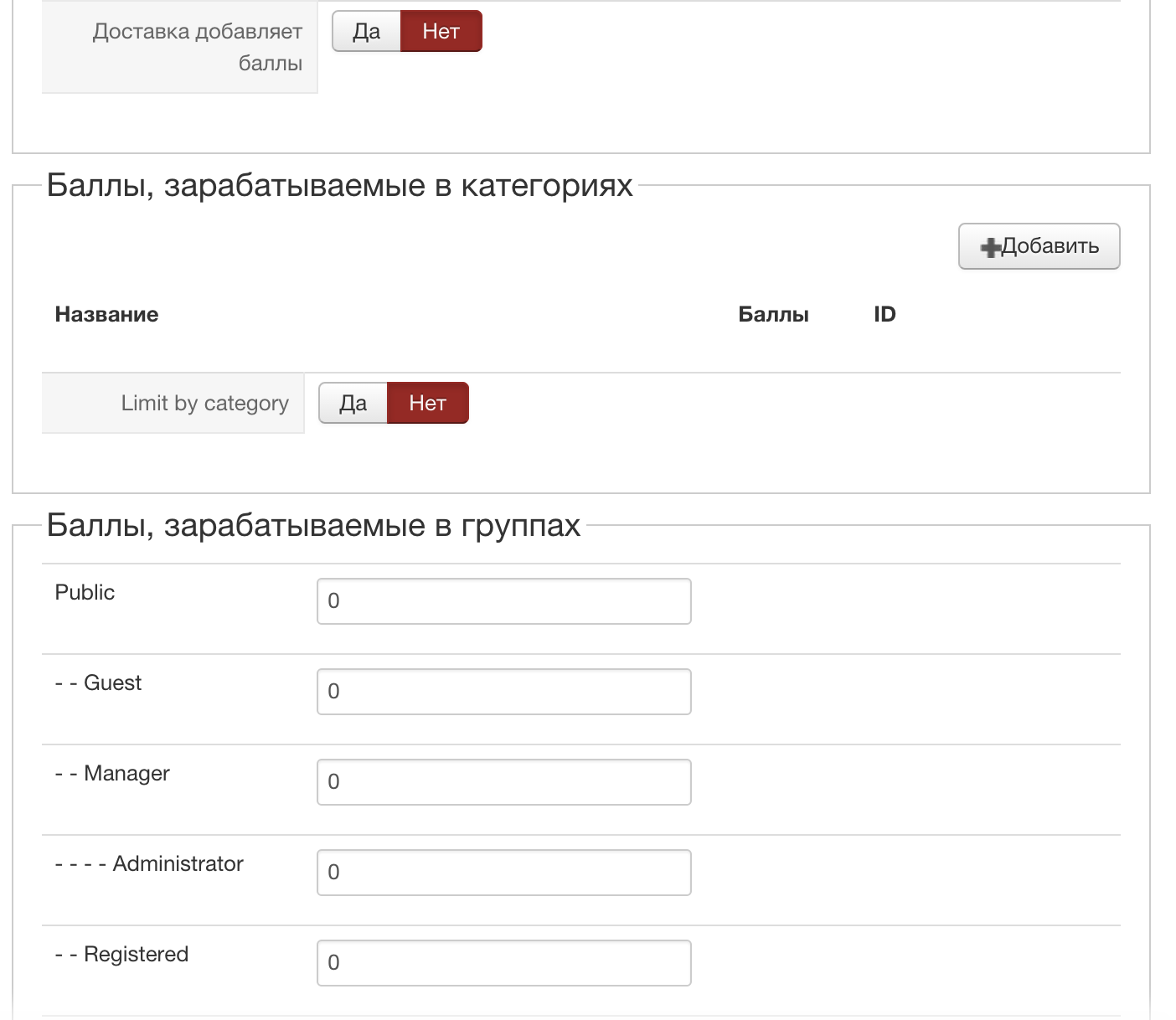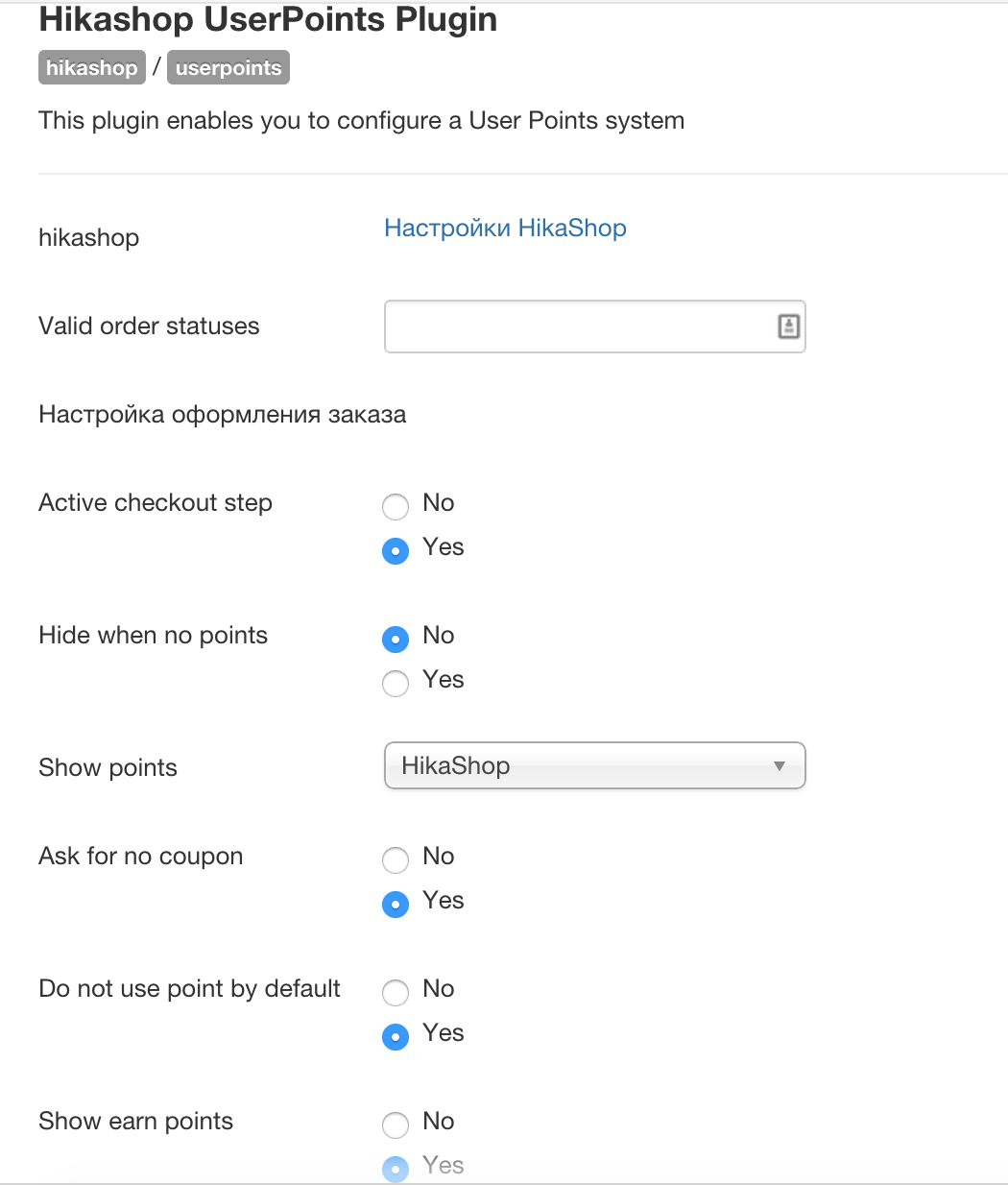 - В плагине HikaShop user points устанавливаю настройки следующим образом: