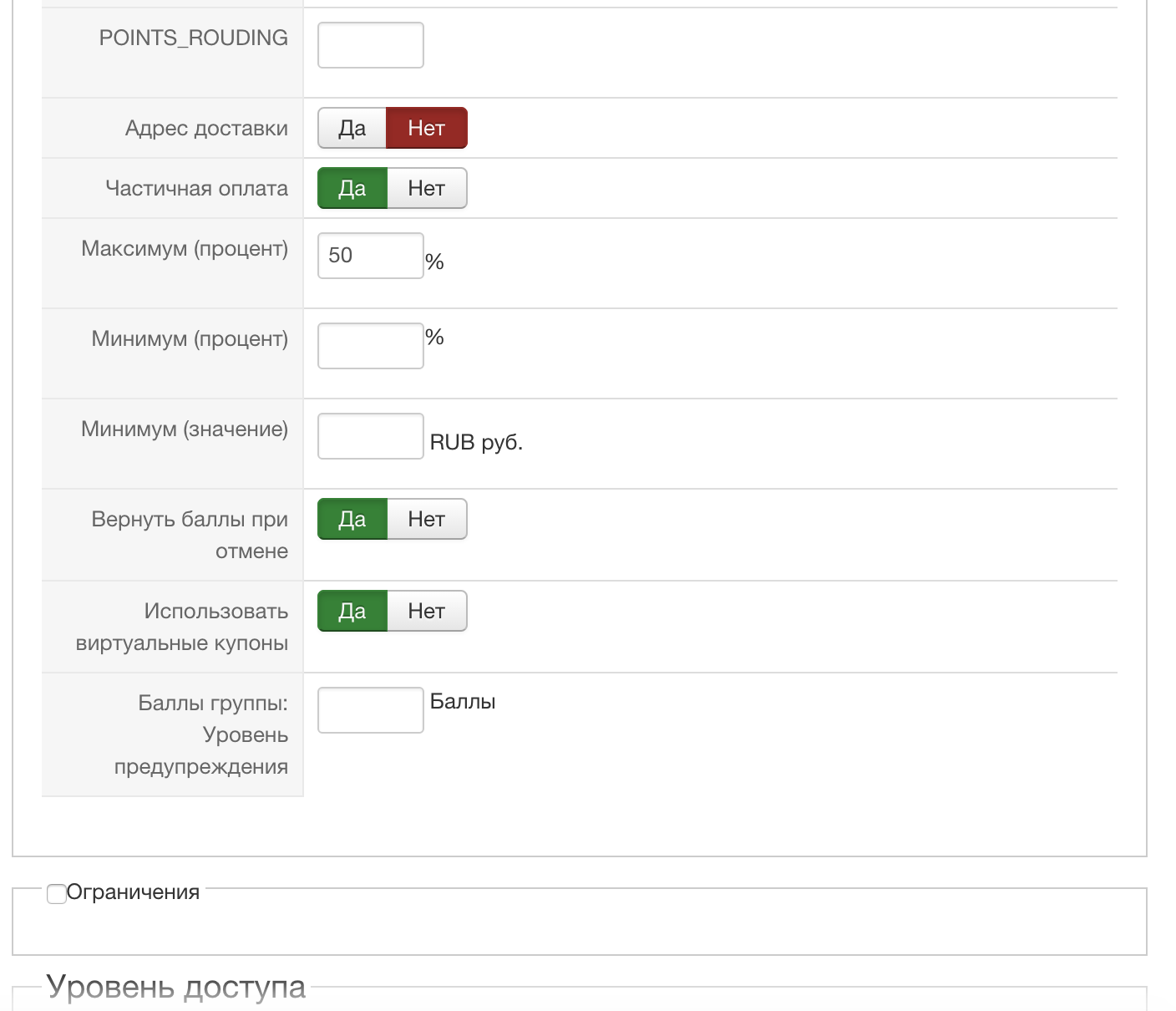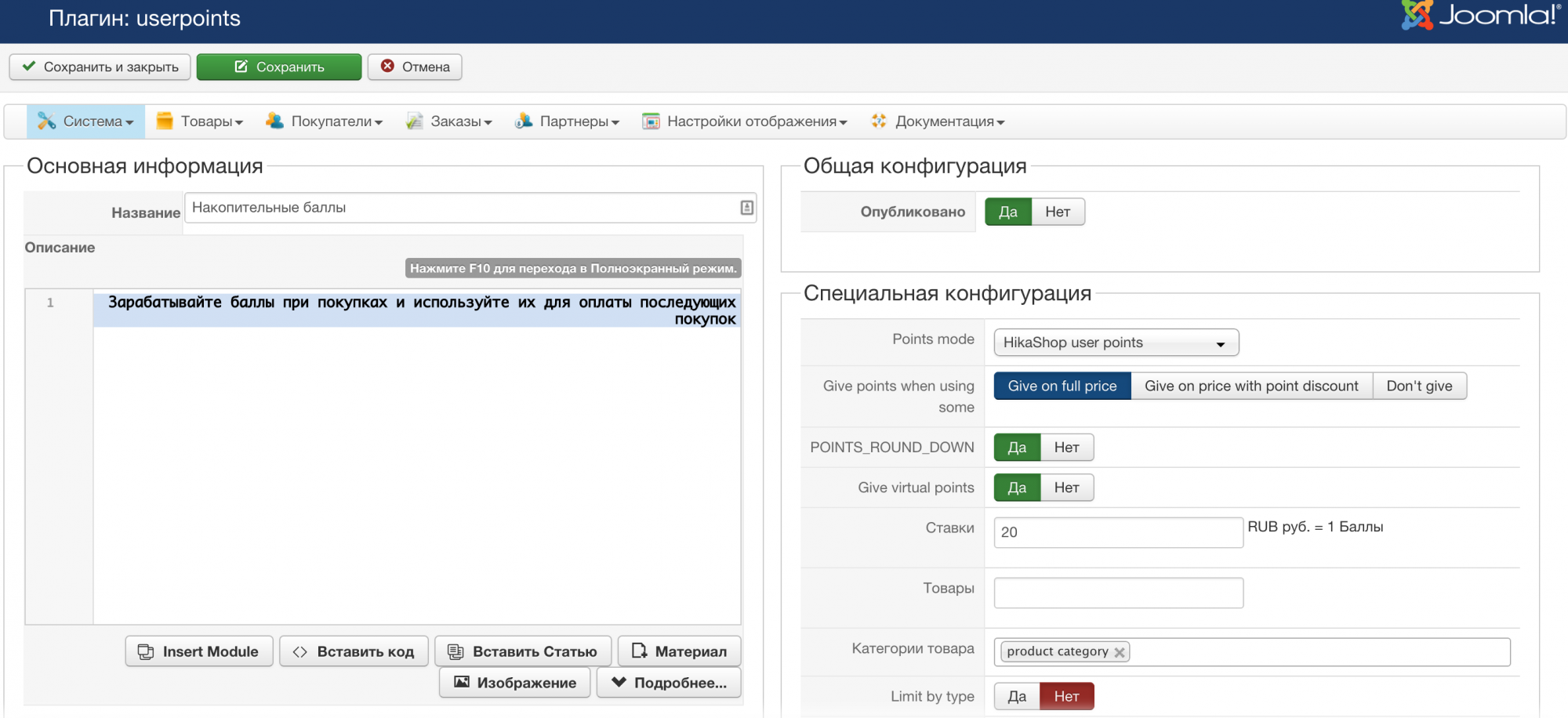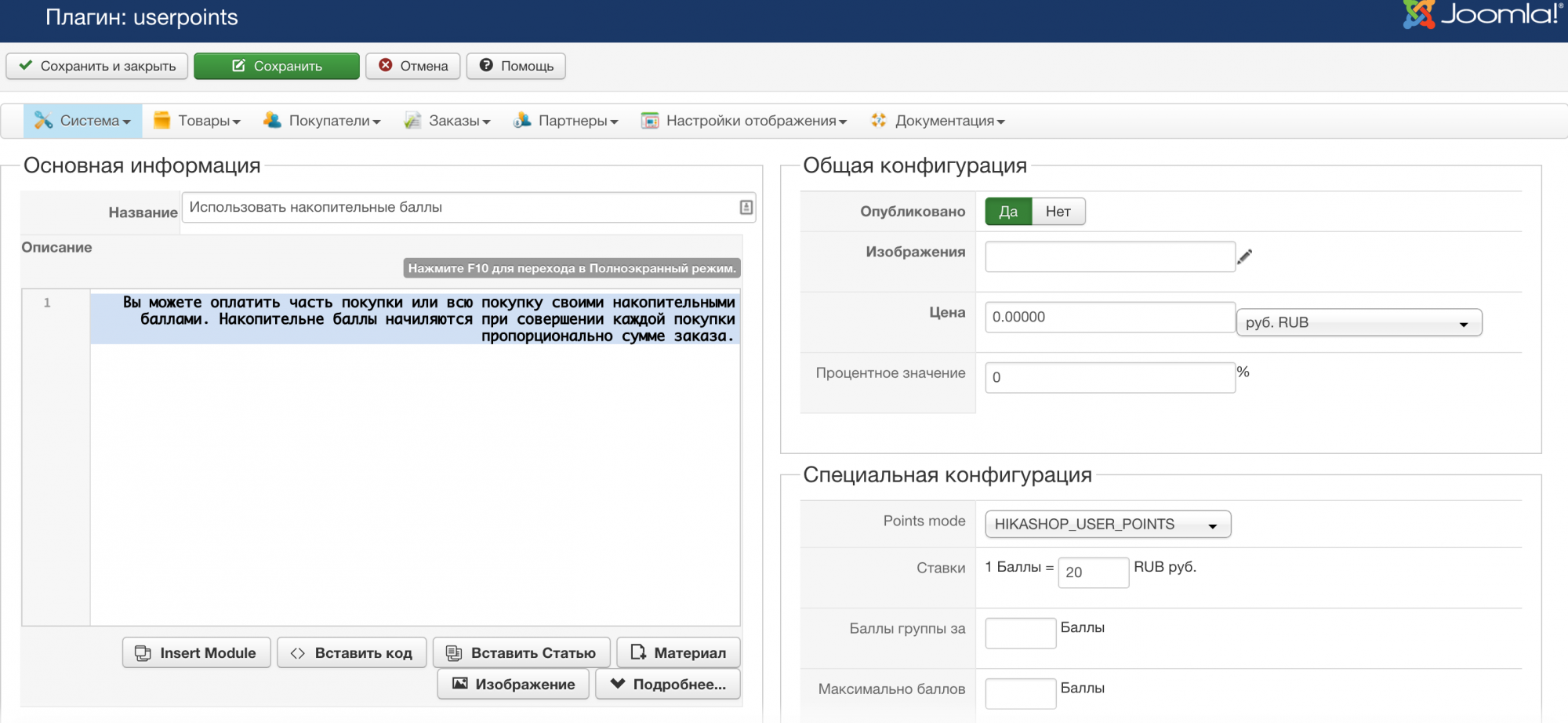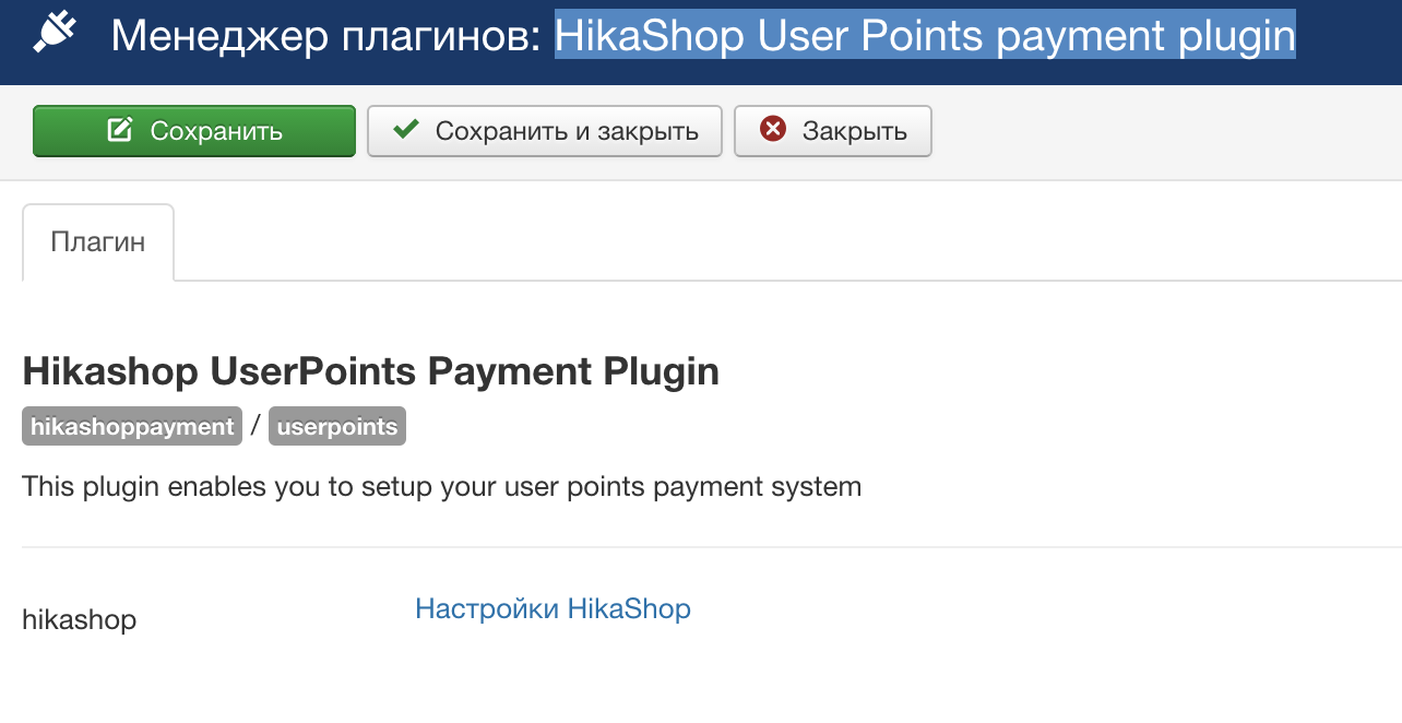 - Затем настраиваю плагин HikaShop User Points payment plugin: