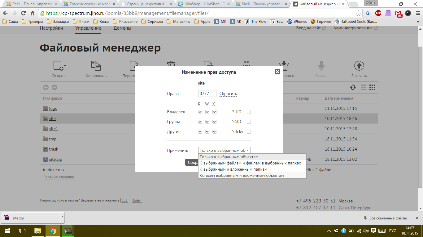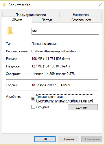 Скачала архив папки site, разархивировала, там атрибут только для чтения стоит. И у меня он не убирается. Глючит винда видимо