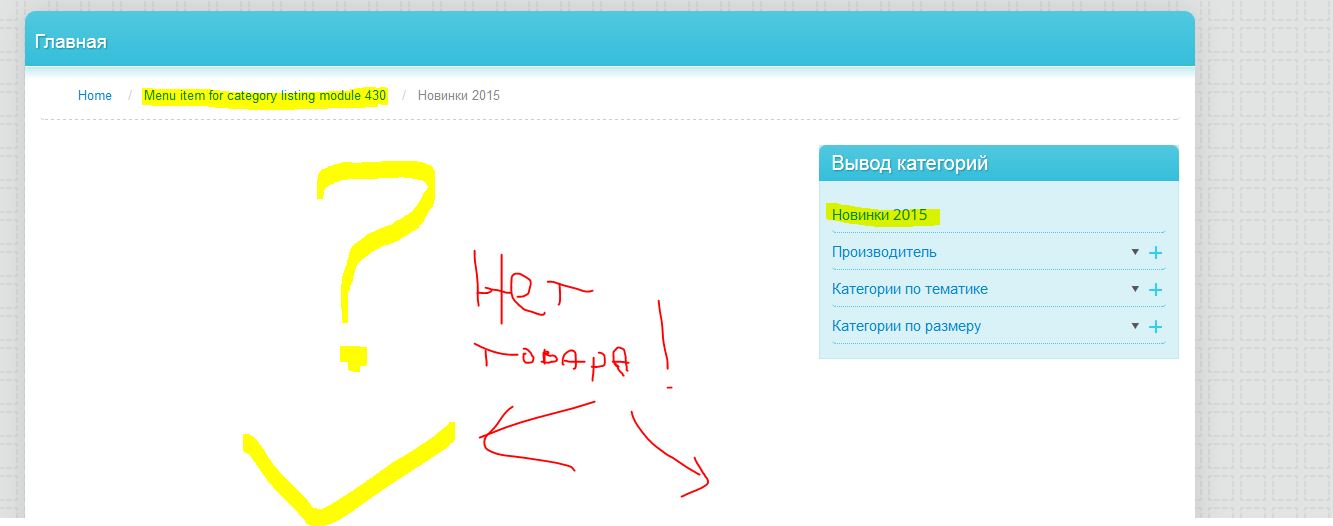 Итак, созданы категории товаров и добавлено несколько товаров в разные категории (В частноскти категория "Новинки 2015" на скриншоте из первого поста)