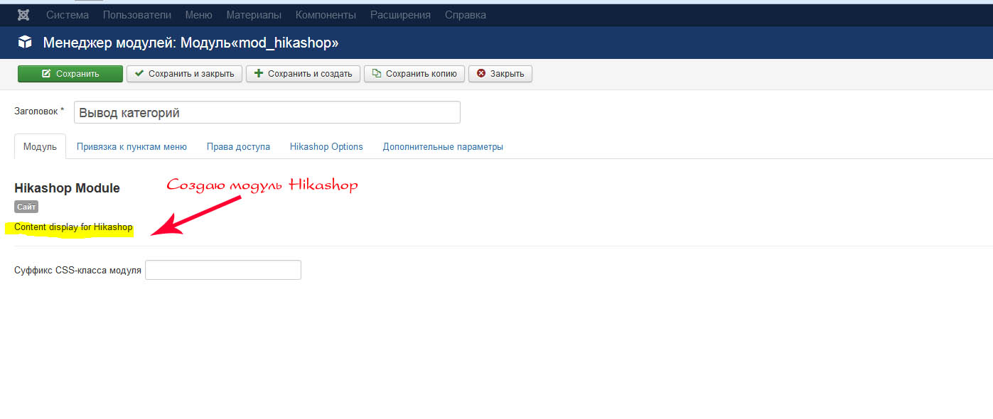 Создаю модуль типа Hikashop Content (см. скриншот№1 ниже)