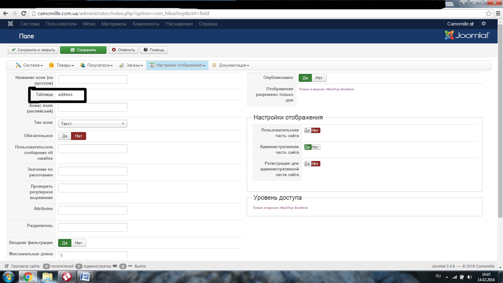 Проблема связанна с тем что я захожу в Hikashop - конфигурация -настройки отображения - дополнительные поля - выбираю создать дополнительное поле НО ПОТОМ НЕ МОГУ ПОМЕНЯТЬ Таблицу address на любую другую (фото постараюсь выложить)!