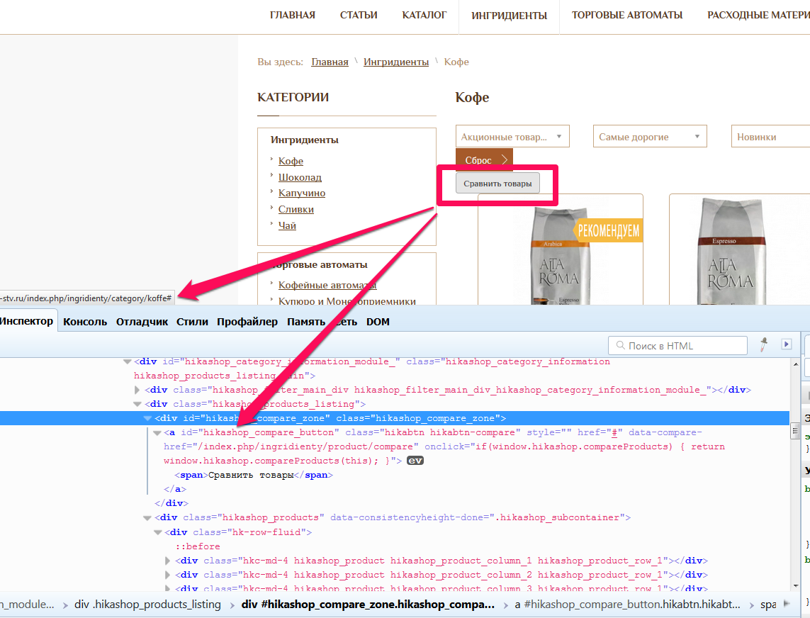 Кнопка "сравнить товары" не работает.... то есть не открывает страницу сравнения товаров и вообще ни как не реагирует на нажатие... (то что css сползло и нужно править внешний вид не самая главная проблема в копке... главное чтобы работала)