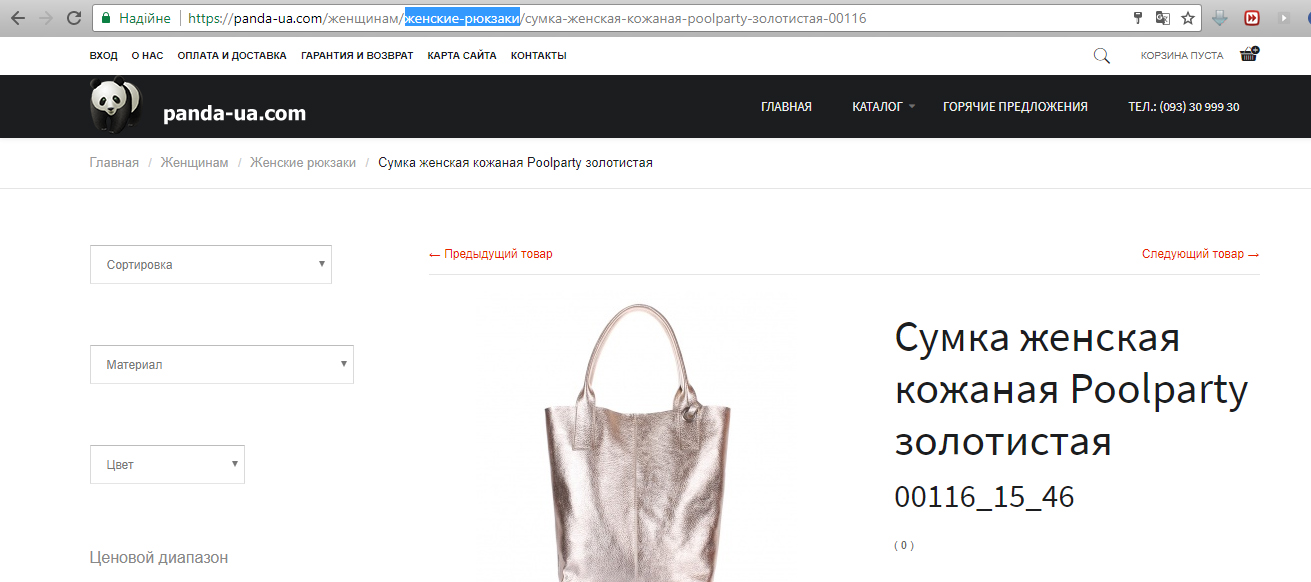 На скриншоте показан пример такого дубля. "Женские рюкзаки" и "Женские сумки" - это две разные ветки категорий.