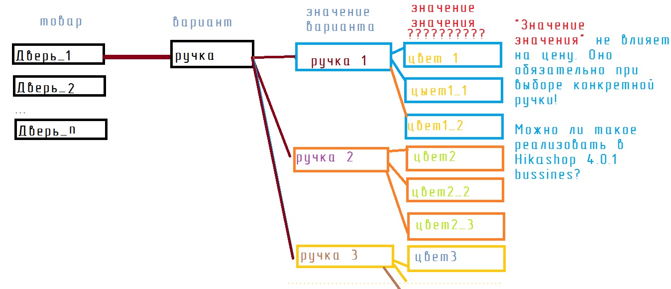 Есть товар "Дверь №1"(со стоимостью) у двери есть "Варианты" ручек(№1 +100руб, №2 +200руб, №3 300), а у этих ручек есть "доп значение или поле(как угодно) Цвет" (без изменения стоимости).