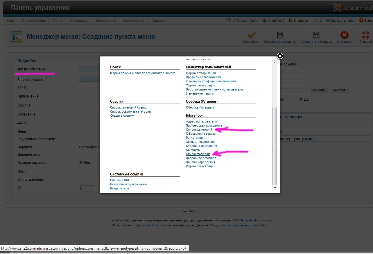 Находим в длинном списке раздел Hikashop и задумываемся - что мы будем отображать в нашем пункте меню? Только товары? Или возможно будут еще и подкатегории?