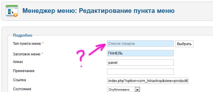 После того как добавили новый пункт меню, мы попадаем в знакомое окно добавления Joomla меню. Ну что же, первое что мы здесь делаем - выбираем тип пункта меню.