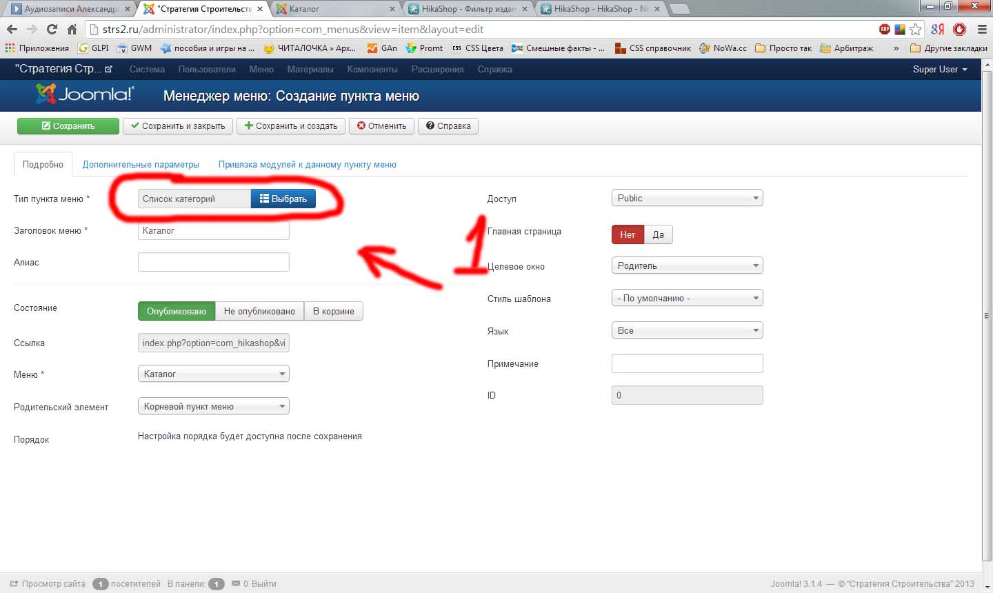 Создаем меню с типом "Список категорий" HikaShop