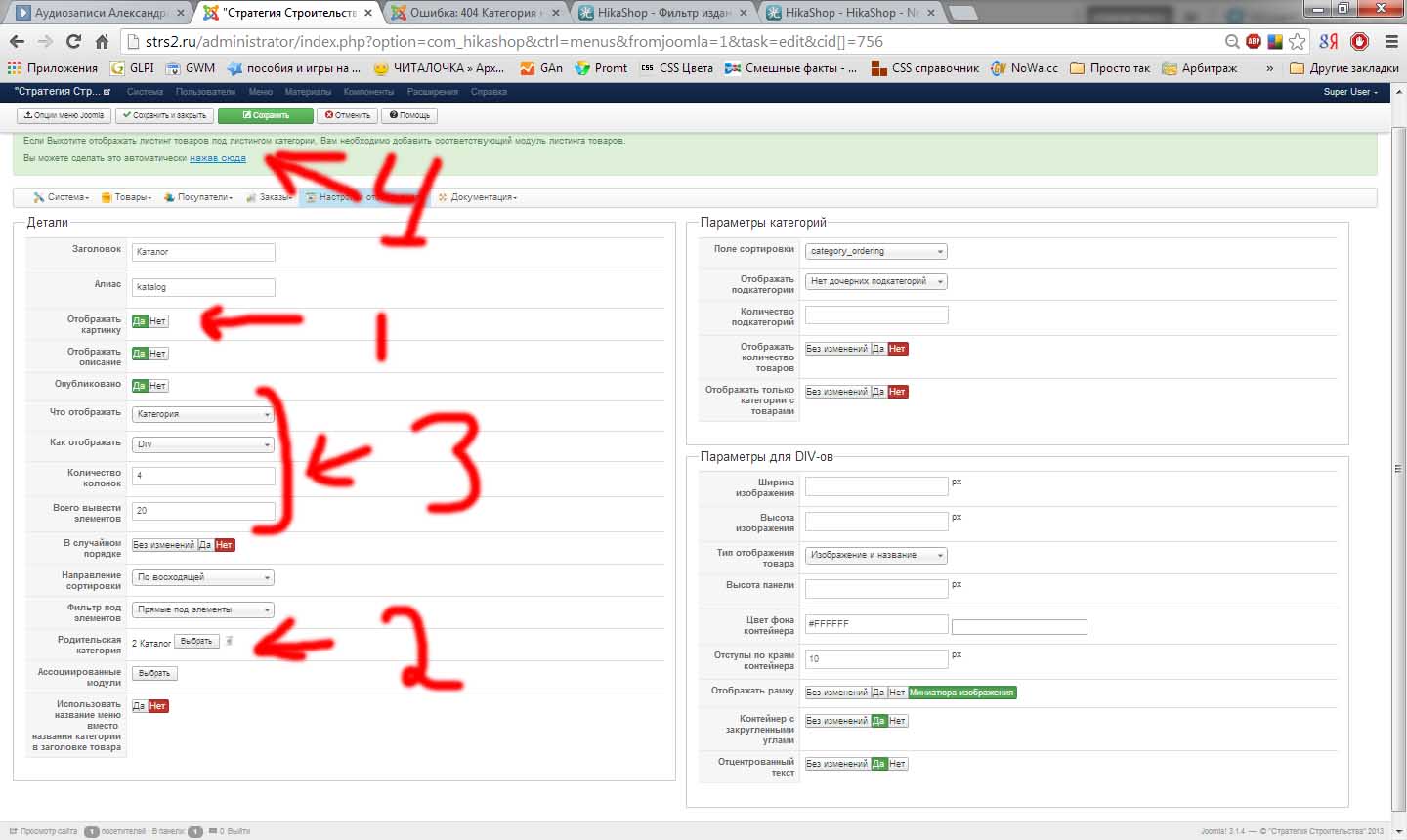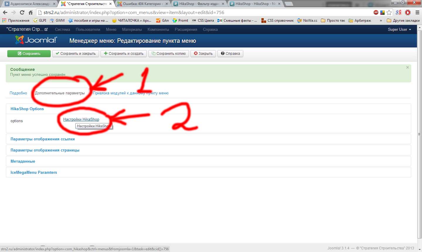 Топаем в настройки нашего пункта меню, выбираем "Дополнительные параметры" -> Настройки HikaShop