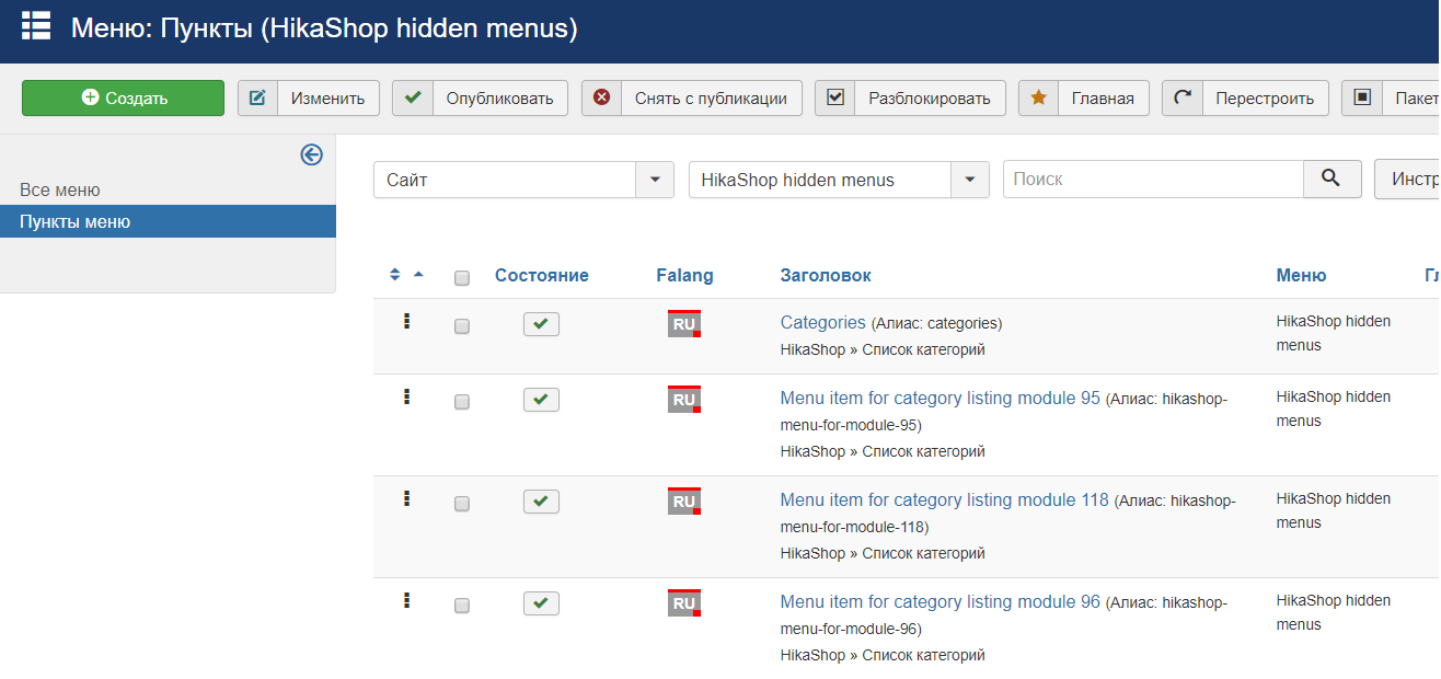 progreccor wrote: если вы хотите показывать сбоку меню категорий хикашоп - публикуете контент модуль хикашоп и указываете тип отображения - список. в качестве содержимого - категории хикашоп.