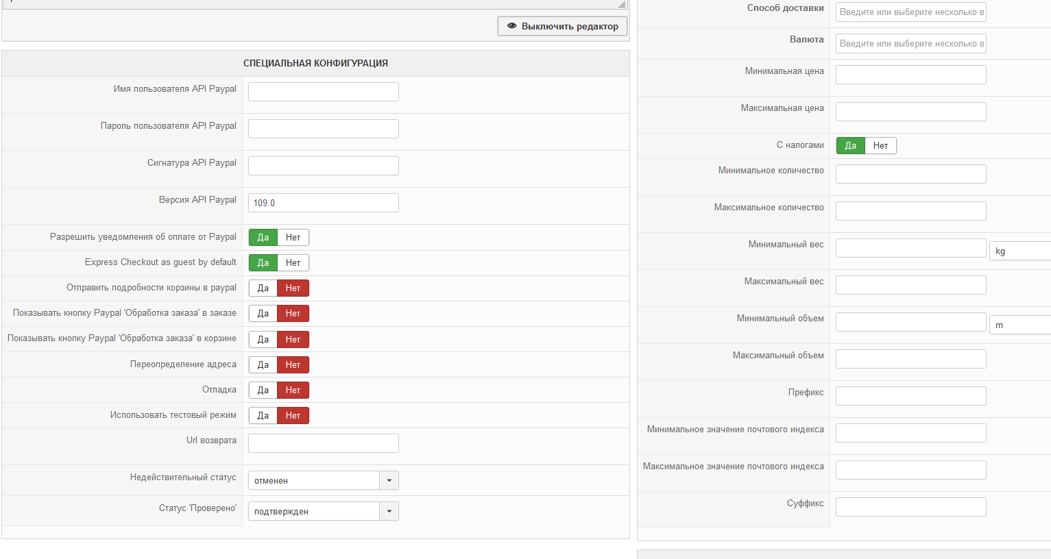 основное что меня интересует в hikashop, есть ли режим, при котором покупателю достаточно положить товар в корзину и нажать checkout, после чего обработка заказа, уведомление о том, что он был сделан и письмо с телом заказа на мой емейл, всё это, генерируется на сайте пейпел. вот настройки компонента.