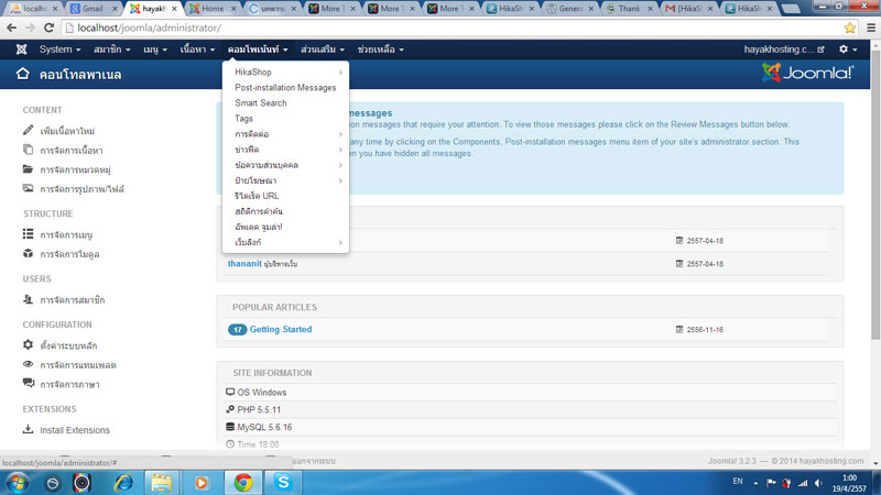 1.ตอนที่ลง Joomla ได้ติดตั้งภาษาไทยเรียบร้อยแล้ว (ติดตั้งจากในระบบ admin ของ joomla) ไม่แน่ใจว่าสำหรับ hikashop ต้องติดตั้งภาษาไทยแยกต่างหากหรือไม่คะ