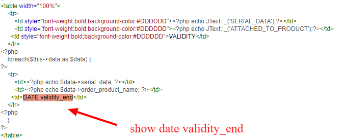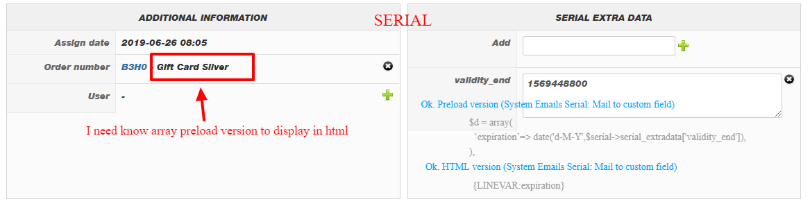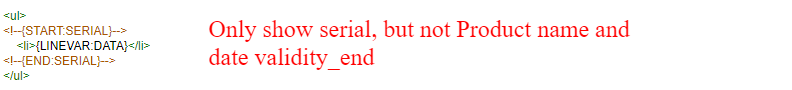 ... frontend / my template / orderserial / show_email_notification_html, can show serial extradata, expiration date (validity_end and format) and a custom value with the code
