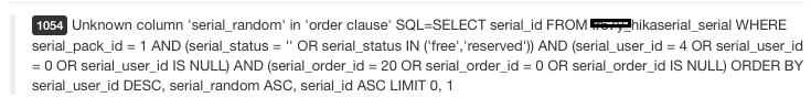 1054 Unknown column 'serial_random' in 'order clause' SQL=SELECT serial_id FROM fr67y_hikaserial_serial WHERE serial_pack_id = 1 AND (serial_status = '' OR serial_status IN ('free','reserved')) AND (serial_user_id = 4 OR serial_user_id = 0 OR serial_user_id IS NULL) AND (serial_order_id = 25 OR serial_order_id = 0 OR serial_order_id IS NULL) ORDER BY serial_user_id DESC, serial_random ASC, serial_id ASC LIMIT 0, 1