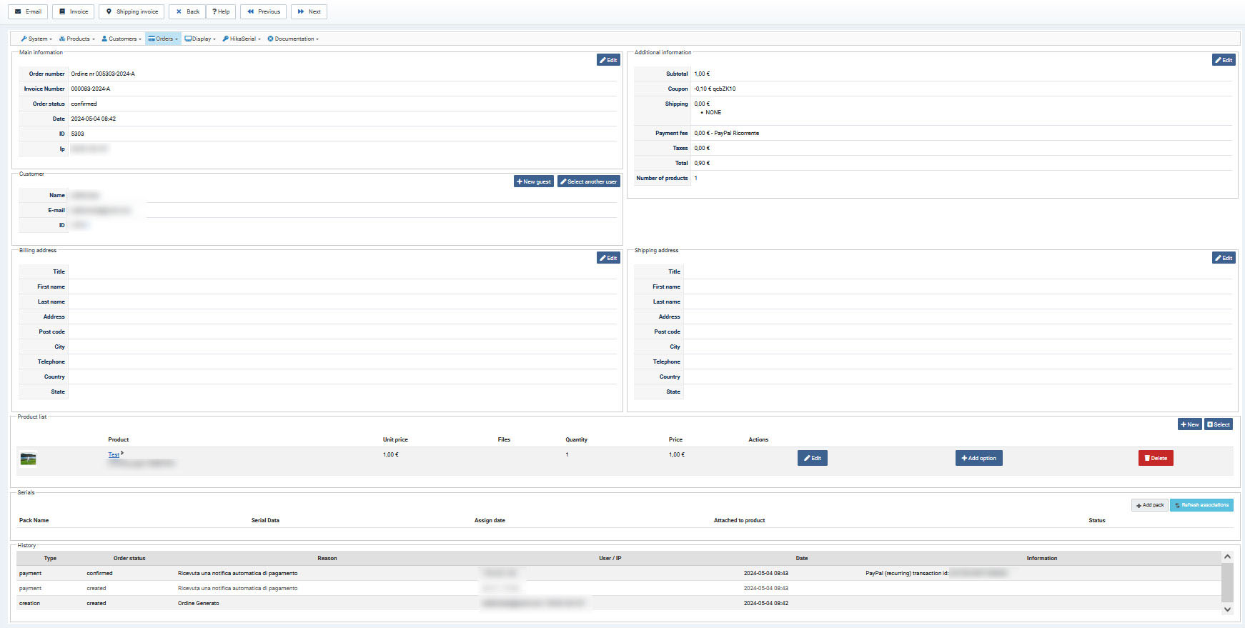 The first test, without coupon, went well, the order and the renewal order were done correctly.