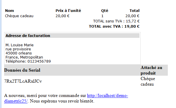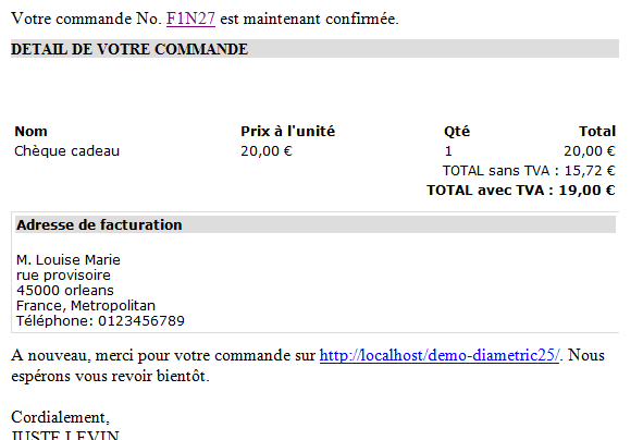 <td>A nouveau, merci pour votre commande sur http://localhost/demo-diametric25/. Nous espérons vous revoir bientôt. <br /> <br /> Cordialement,<br />JUSTE LEVIN</td>
