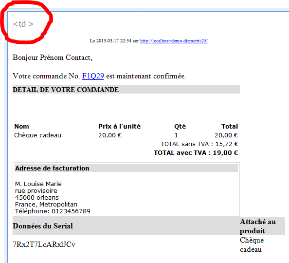 <td><br />M. Louise Marie<br />rue provisoire<br />45000 orleans <br />France, Metropolitan<br />Téléphone: 0123456789</td>