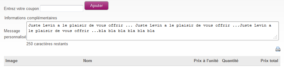 <td><br />Message personnalisé : Juste Levin a le plaisir de vous offrir ... Juste Levin a le plaisir de vous offrir ...Juste Levin a le plaisir de vous offrir ...bla bla bla bla bla bla</td>