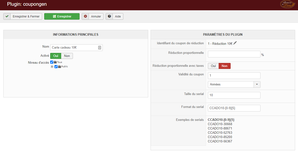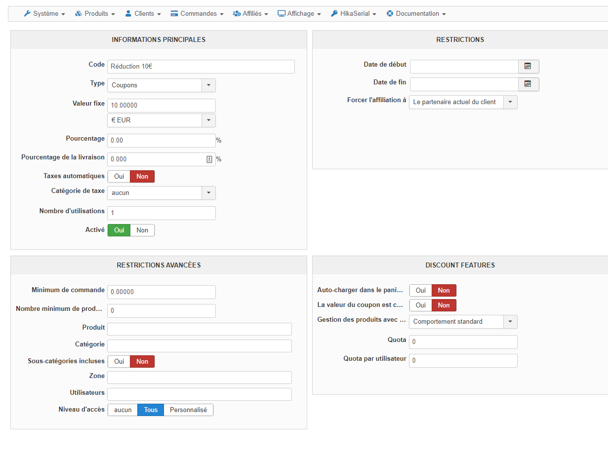 En effet, les coupons HikaShop, leur configuration et leur restrictions est spécifique à HikaShop et non HikaSerial.