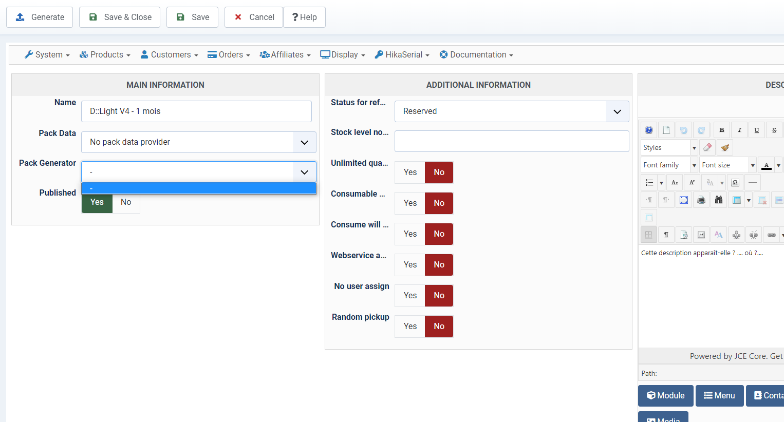 De plus quand on affiche les packs (capture 1), on voit le générateur ("plg.LimeLMgen-2") mais quand on ouvre le pack, le déroulant est vide (capture 2). Bien que je pense qu'on n'utilise plus ce mécanisme. Cela fait bien longtemps que je ne me suis pas replongé dans HikaSerial.