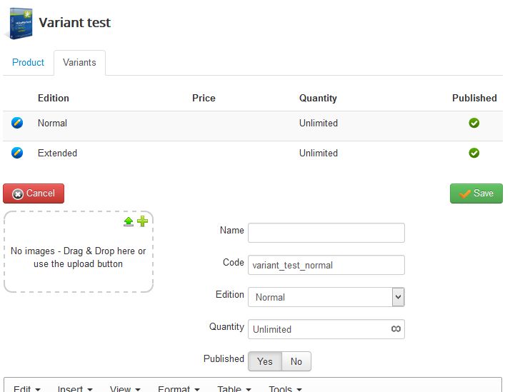 It does not handle the custom fields "file" and "images" which are not compatible with the "dynamic ajax save". So we will add some checks in order to submit the all page when someone will try to save a variant with some data in this kind of custom field.