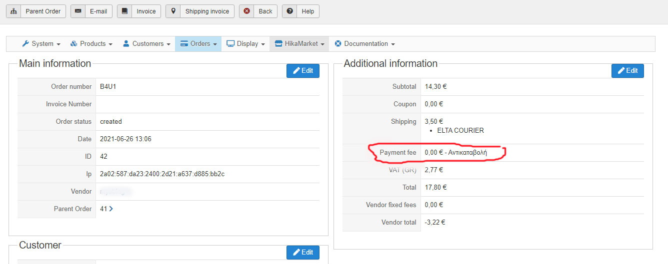 we do not know why system does not calculate the Payment fee to vendors like calculated to clients), and VAT 2,77 euro and to the vendor the sum total he see is 17,80 euro instead the 20,30 which was the amount client paid. This happening because on the vendors order analysis the system does not calculate the Payment Fees which shown as 0 like you can see on the picture below. Also same analysis vendor receive in his email.