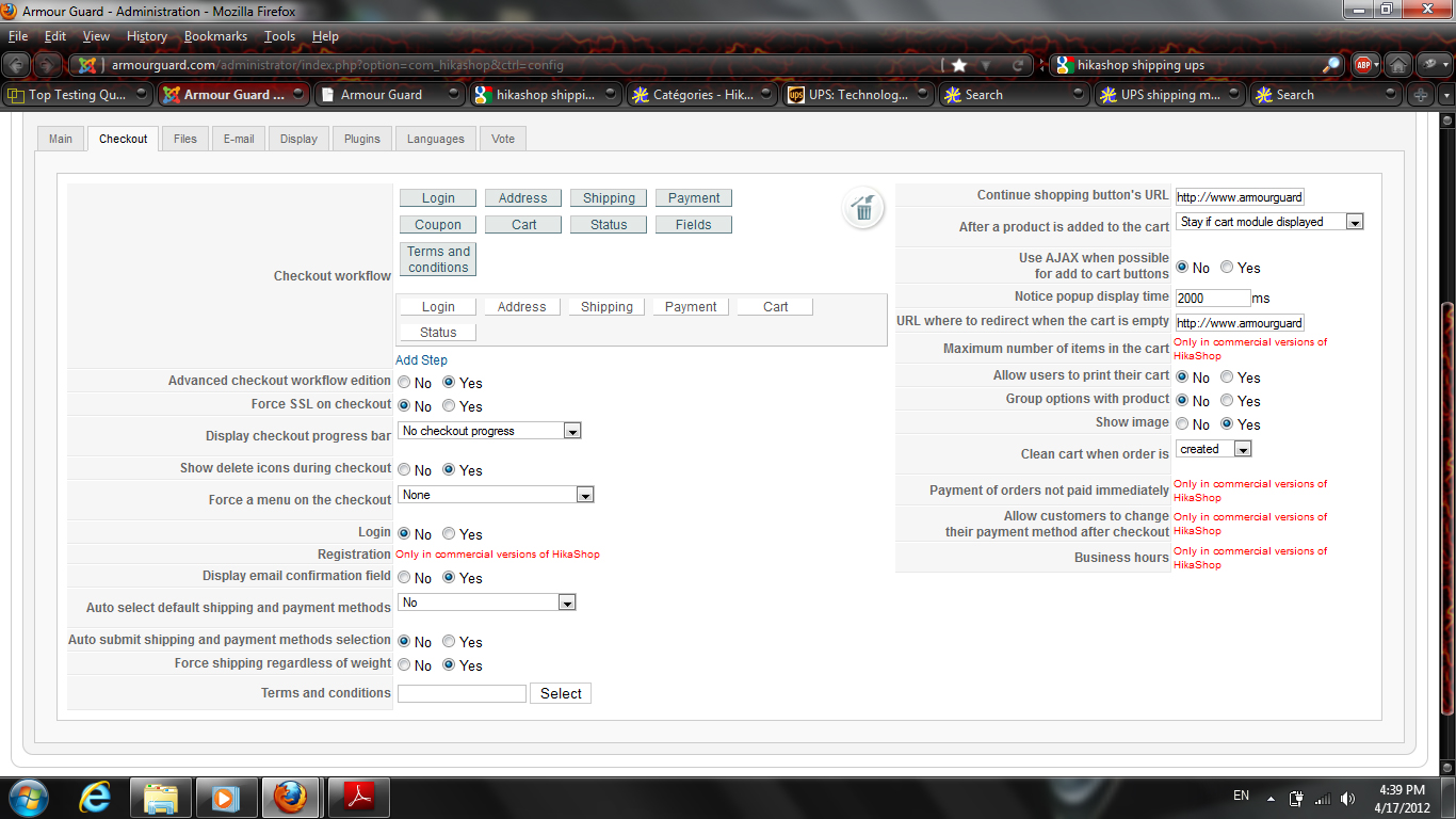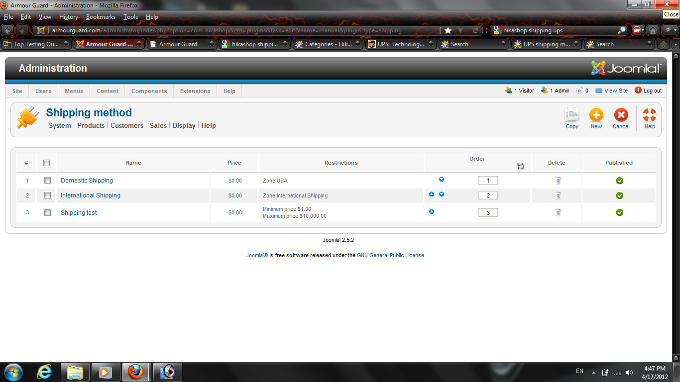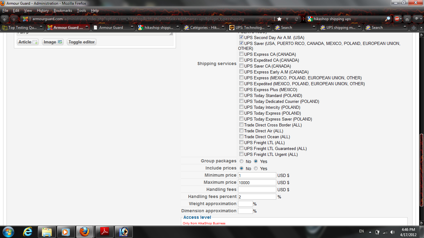 This is an absolutely superb shopping cart for Joomla. Much easier and more intuitive than Virtuemart, OSCommerce, Zen Cart and many others. I'm enjoying it so far. We don't have that many items in our cart so I'm copying them over manually from Virtuemart. But I'm having the same problem with the UPS shipping plugin. I configured everything but the UPS shipping method doesn't show up in the front end. Only the Manual plugin shows up. Screenshots attached. Please help and thank you for such a great shopping cart!