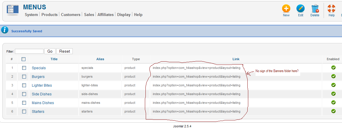 I have looked everywhere to find the reference to the Banners folder but there is none in any of the products, nor the categories nor the hikashop config so how is the additional folder called Banners being added by either joomla or hikashops. I should mention again that the menus work for all other linked items except hikashop components.