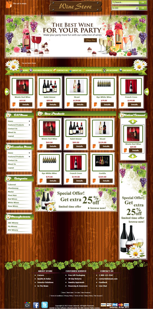 Green Cabernet, all new Joomla 2.5 and HikaShop 1.5.7 template that was designed specifically for wine stores, has been released today. Although the header was designed primarily for wine template, this template actually is very general and can be used by any kind of stores or lines of business.