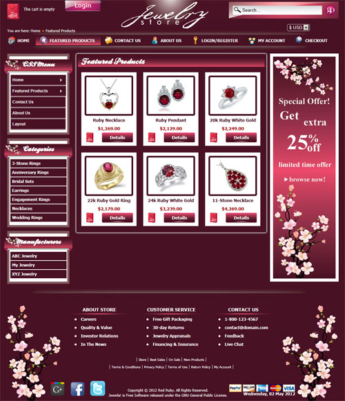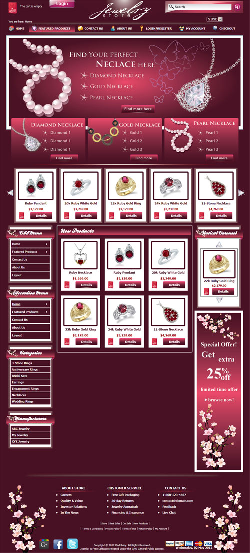 Red Ruby, all new Joomla 2.5 and HikaShop 1.5.7 template that was designed specifically for jewelry stores, has been released today. Although the header was designed primarily for jewelry template, this template actually is very general and can be used by any kind of stores or lines of business.