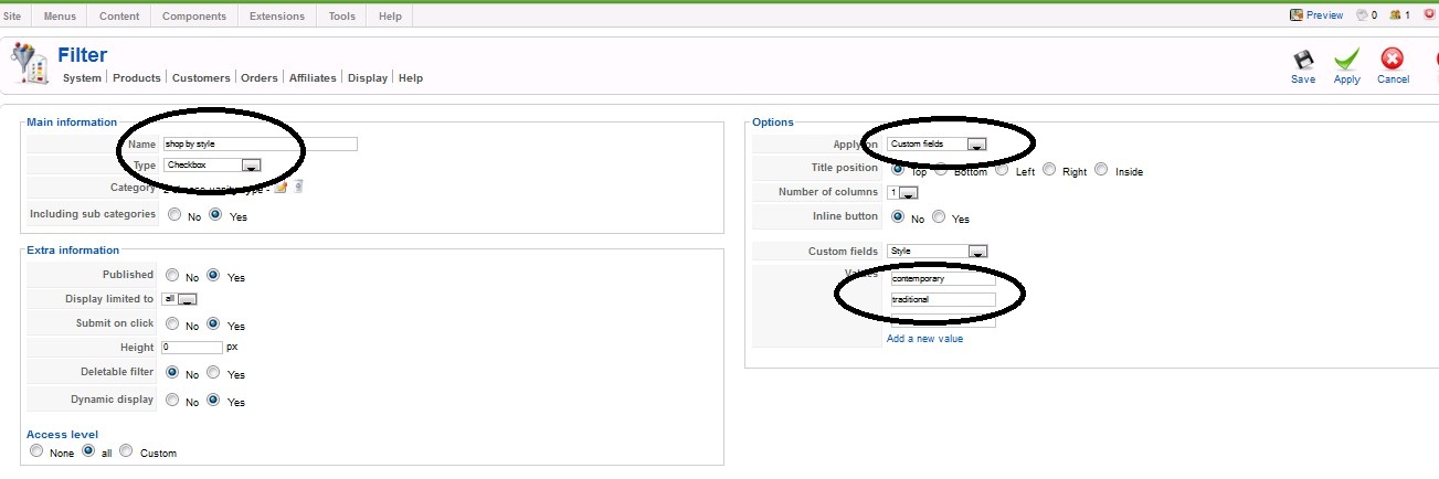 - filter by style, I selected "check box" and choose "style" (one of the custom field item),then put in values , see screen shot. But after I saved it and I click in again, the values disapear, and the values were not displayed on the front end as well.