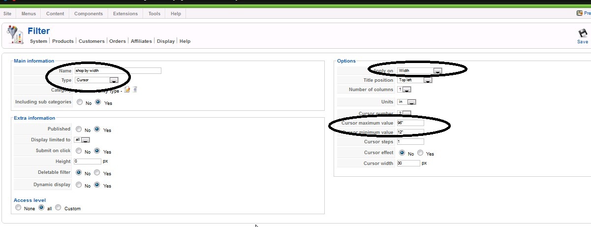 - filter by width, I selected "cursor" and choose "width"(one of the custom field item),then put in the min.and max value, but same thing, it doesn't appear at the front end as well.