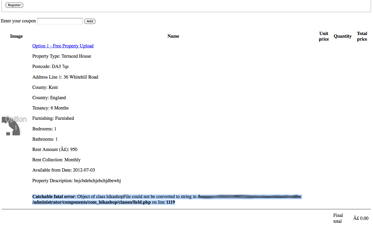 It is a property website, where users can upload the details of their properties, which are then sent by email to the site admin (this is what I use hikashop for), who then inputs the details into a real estate component in the back end, to then be displayed on the site. Here, you will see at the bottom of the form, the option to upload up to 10 images. When this product is purchased, an order email gets generated and sent to the site administrator with all of the details from the form (including links to the images). However, for some reason when you click the link on the images, instead of downloading the image, you get the problem as described in my previous message.