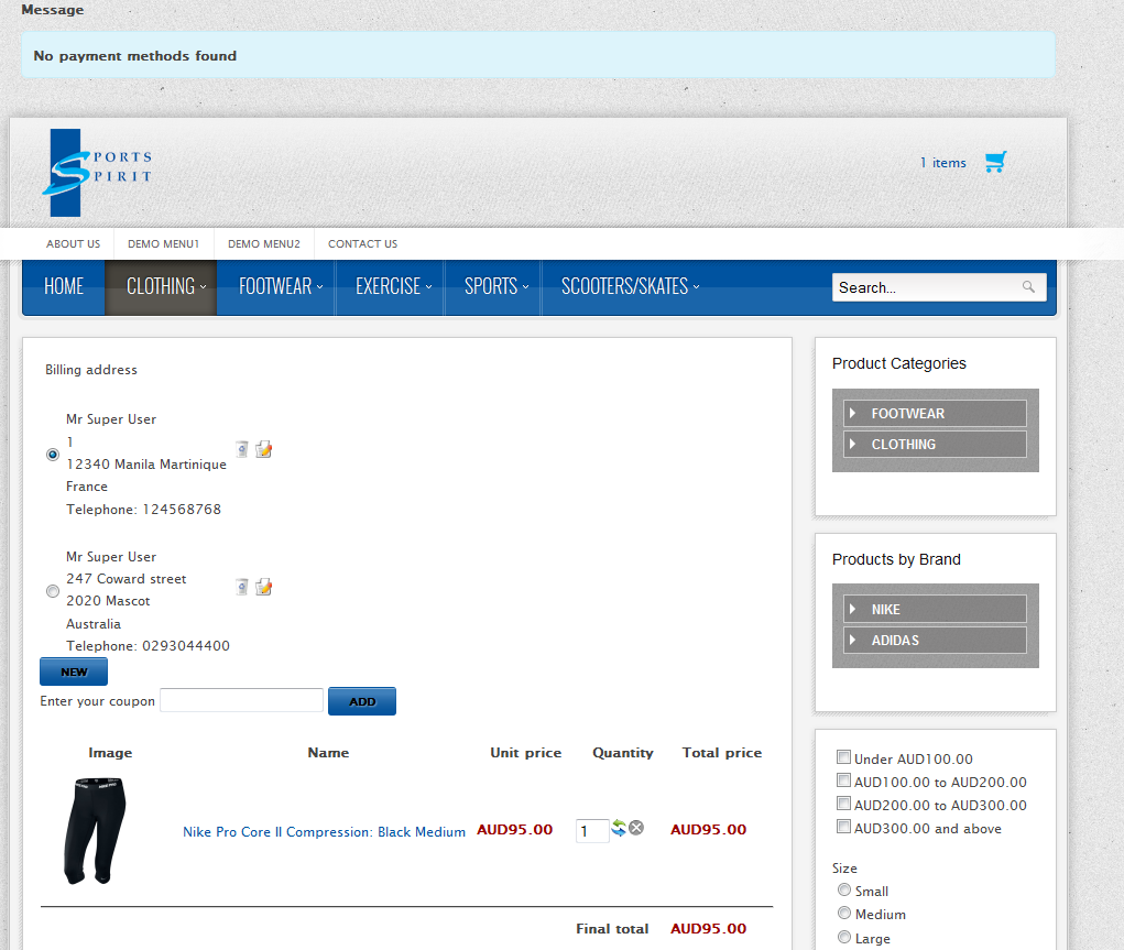 I followed the instructions and when the address is overseas, the user doesn't get the 'Payment Method' option, therefore, cannot proceed with the checkout. On the top of the website, a message appears as 'No payment methods found'.
