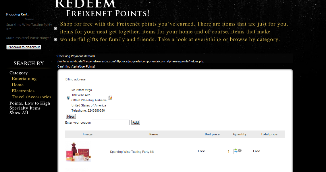 Then, make sure that your user has enough points (more than 10 times the total amount in dollars since 1 points = $0.1) or turn on the "partial payments" option of the AlphaUserPoints plugin.