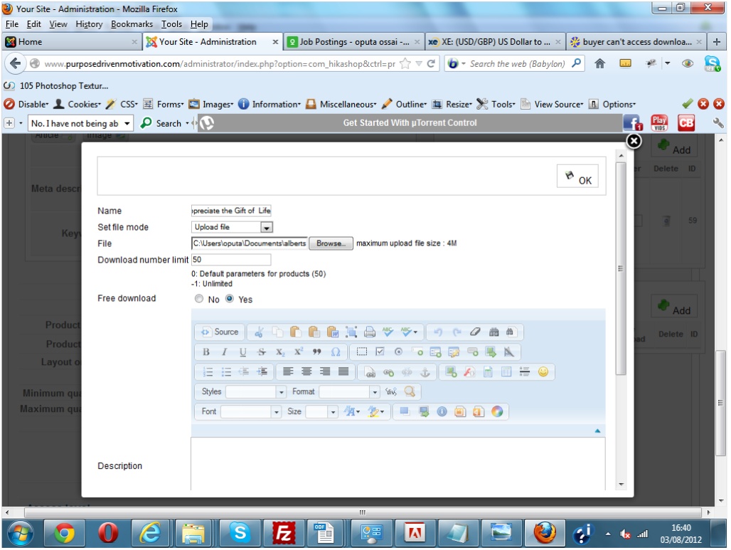 The products that are giving me problems are large MP3 files. Because i could'nt upload them with Hikashop's file uploader, following some of your forum solutions, i instead uploaded (through the Hikashop file uploader) a very small zip file. Then i ftped the real MP3 file with the exact same name as the small file that i uploaded through the Hikashop file uploader.