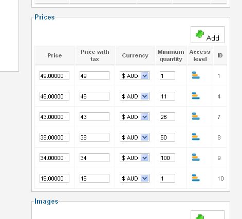 The last price of 15.00 is set to access level - Resellers. The other prices are set Public.