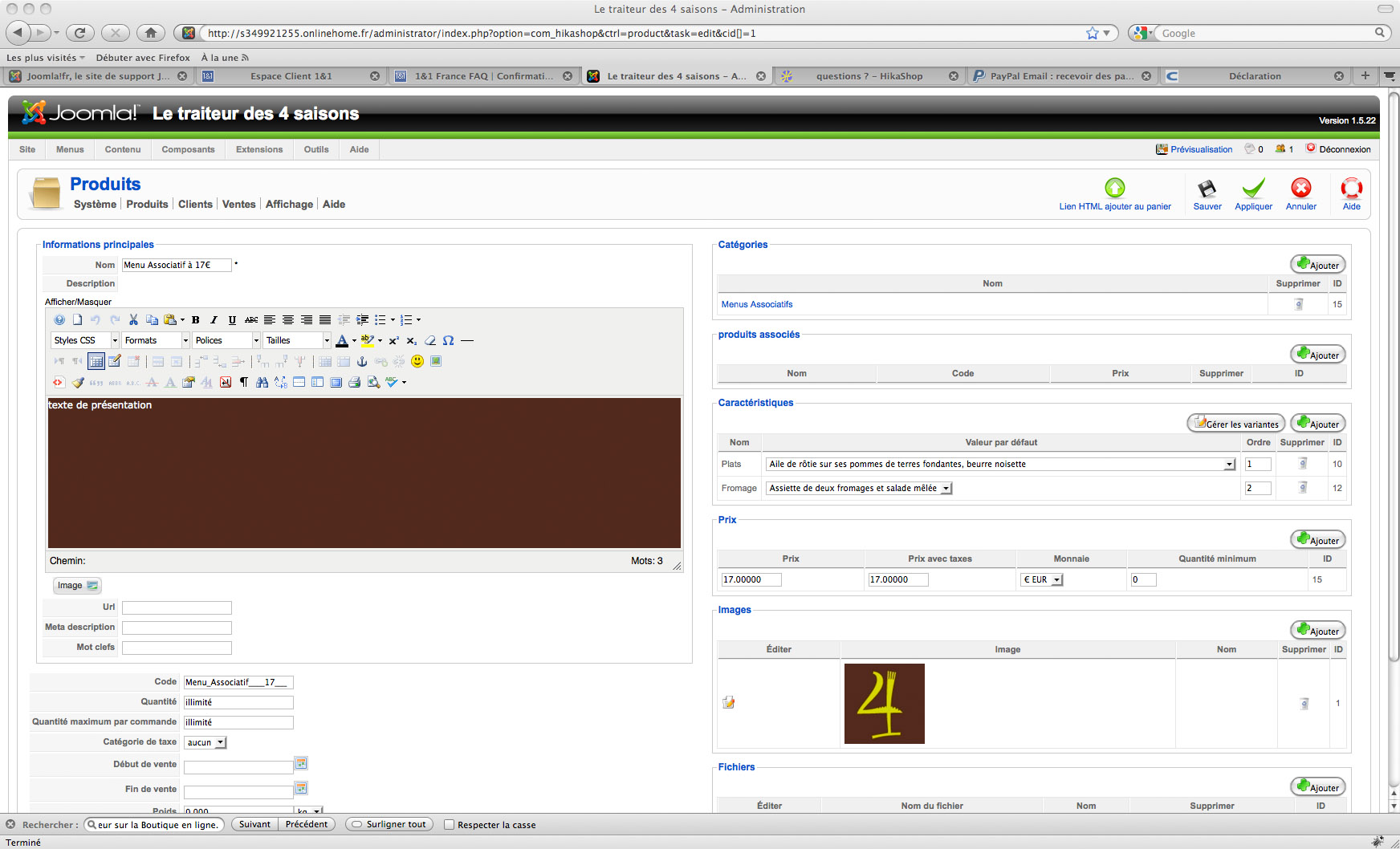 Well, for the fact that you have an error when saving 8000 variants information in one page, the problem is the hosting company... We can't do much more than what we did. There are two options: use another hosting company (or upgrade to a less restrictive plan), or change the way you want to display your products so that you don't have 8000 variants for a product. For example, you could use the entries form feature ( www.hikashop.com/fr/support/documentatio...ikashop-entries.html ) where you could ask the user questions about his event like the date, the menu type he would like and the type of meals, etc and then link the fields to products so that they would be automatically added to the cart and the user directed to the checkout once the user validates his entry.