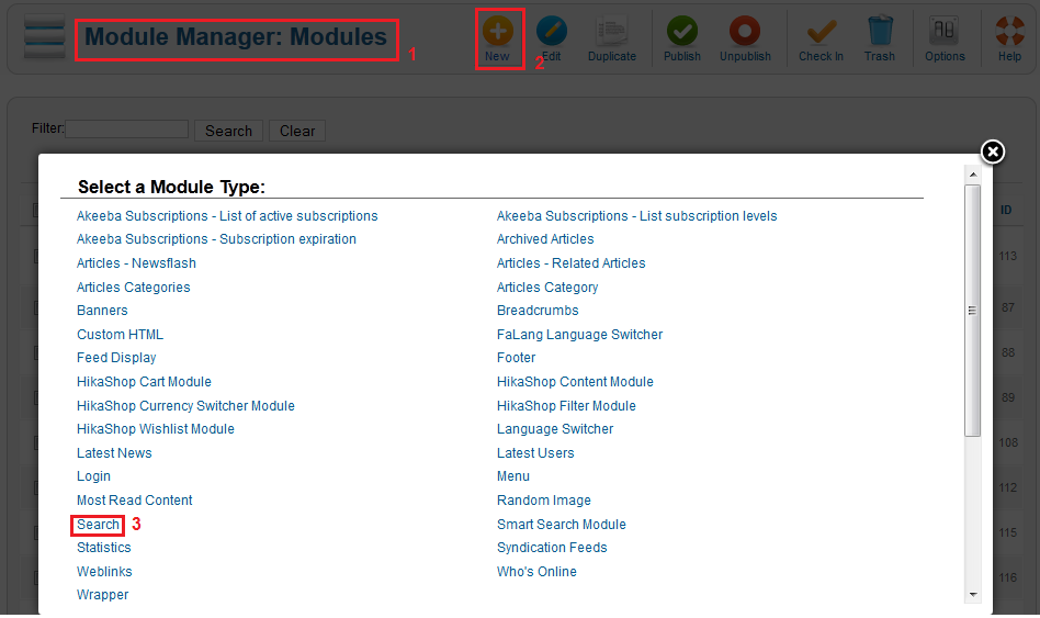 There is not Search Window in joomla and there is not Search Window in Hikashop