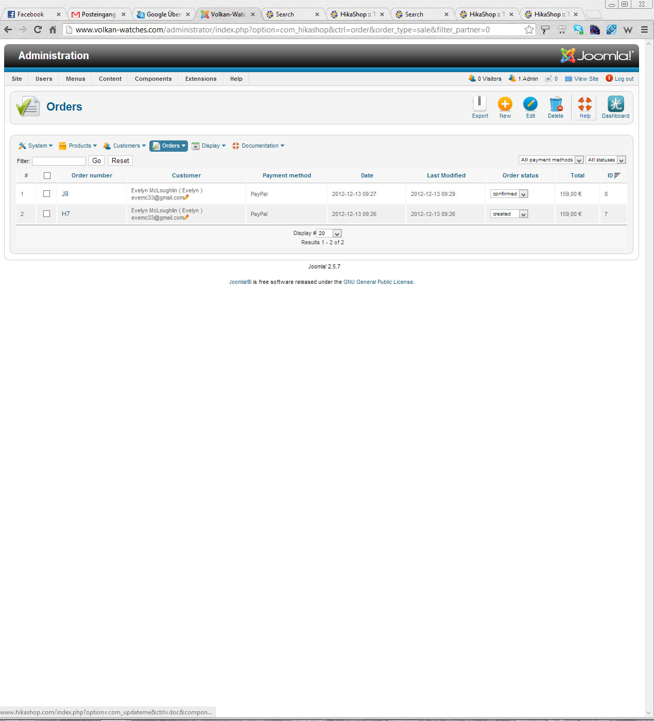 In our administration area Components - Hikashop - Orders two orders are appearing (J8 & J7). One is confirmed (J8) and one is created (J7). They both come from the same person and we had one payment made to our Paypal account.