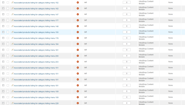 Hikashop creates content modules such as "Associated products listing for category listing menu 152" that are unpublished as you can see...