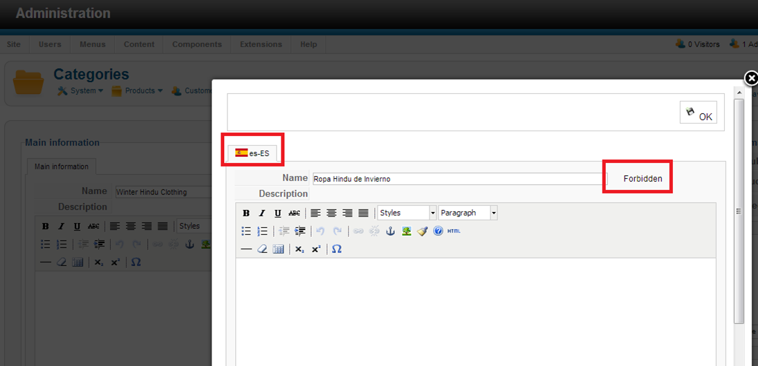 I don´t know what is causing the conflict, but when I click the spanish button next to the category title, and then try to enable my transation it syas ¨forbidden¨ instead of turning green.