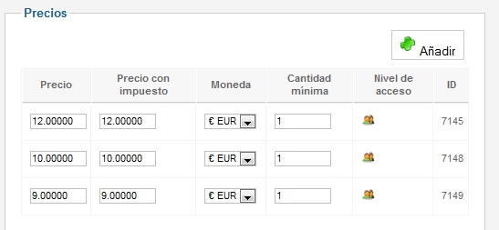 Hello, I added various rates to a product, and I assigned each to a different user group. The first rate, the group "Public", and the other rates to other groups hanging from the father "Registered". When exporting the test product, which I have seen is that it uses the column "price_value" to indicate the different rates, separated by vertical bars. And to indicate groups of users accessing each rate, we use the column "price_access" indicating the group ID (with commas) and separated by vertical bars, it would be something like: